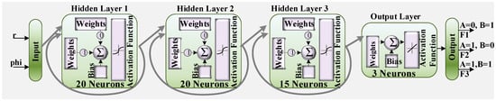 The structure of the proposed RNN model is depicted in Figure 3. Three hidden layers are considered with numbers of 20, 20, 15, and 3 neurons in hidden layers and the output layer. The activation functions used in the network layers are ‘tansig’ (hyperbolic tangent sigmoid transfer function), ‘logsig’ (logarithmic sigmoid transfer function), and ‘purelin’ (linear transfer function). This configuration of activation functions allows for a mix of nonlinear and linear transformations across the network, enabling it to capture complex relationships between the inputs and outputs. This neural network is presented to learn from and adapt to the intricate dynamics of the photonic system, by using the recurrent connections inherent in the applied RNN.