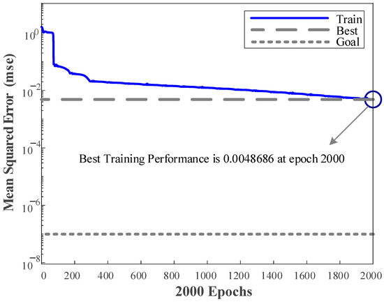 Figure 4 shows a plot of the Mean Squared Error (MSE) versus the number of training epochs for the presented RNN model. The plot indicates a trend of decreasing error, where the MSE starts at a higher value and gradually reduces as the number of epochs increases, eventually reaching a value of 0.00486 after 2000 epochs. The MSE measures the average of the squares of the errors, which is the average squared difference between the estimated values and the actual value. A decreasing MSE over epochs signifies that the network is effectively learning from the training data, refining its weights and biases to better predict the output powers of the XOR gate under various digital conditions. The applied MSE for the presented model is written in Equation (1).
