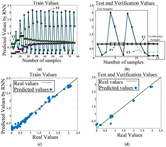 The performances of the presented RNN model are depicted in Figure 5. As seen, the predicted values of the F1, F2, and F3 outputs are predicted accurately. From the 92 obtained samples, 77 samples are used for training the model and 12 samples are used for testing the model. Also, three samples are selected for verification of the presented model, which is also shown in Figure 5. The obtained results shown in Figure 5a indicate the accuracy of the RNN model in learning from the training data. The real output powers (actual values) and the predicted output powers (values estimated by the RNN model) are plotted against the number of samples. The close alignment between the real and predicted values demonstrates the model’s effectiveness in capturing the relationship between input parameters and output powers during training. The results shown in Figure 5b, which is plotted for the test data, reveal how well the RNN model generalizes to unseen data. The consistency between the real and predicted values in the test data indicates the robustness and reliability of the model. Also, the regression plots in Figure 5c,d, which are plotted for the train and test data, include regression lines that show the correlation between the predicted and actual output powers. The closer the points are to the regression line, the higher the accuracy of the model. Overall, the results shown in Figure 5 indicate the obtained high accuracy of the proposed RNN model in predicting the output powers of the XOR gate, in both the training and test phases.