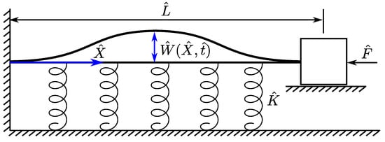 A linear beam is supported by a flexible base and possesses properties such as length , cross-sectional area , mass per unit length , moment of inertia , and modulus of elasticity . Additionally, the beam is subjected to an axial force of magnitude as shown in Figure 1. Assumptions include a uniform cross-sectional area and homogeneous material, in accordance with the Euler–Bernoulli beam theory. According to this theory, post-deformation, cross-sectional planes maintain their planar shape, while lines perpendicular to the central plane retain their perpendicularity. However, lines running across the cross-section do not change in length.