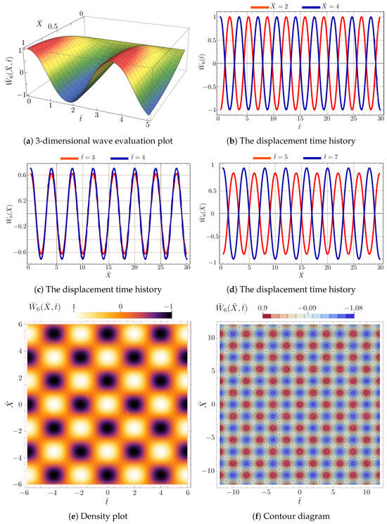 Dynamical behavior of the investigated beam on the solution in the three-dimensional wave evaluation plot, time-dependent two-dimensional displacement plots, density, and contour diagrams for the model parameters: , , , , , , .