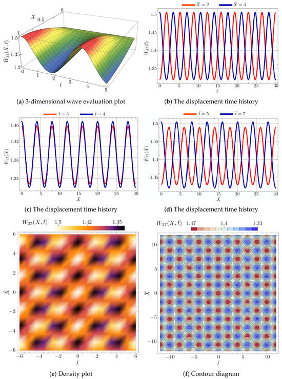 Dynamical behavior of the investigated beam on the solution in the three-dimensional wave evaluation plot, time-dependent two-dimensional displacement plots, density, and contour diagrams for the model parameters: , , , , , , , , , , .