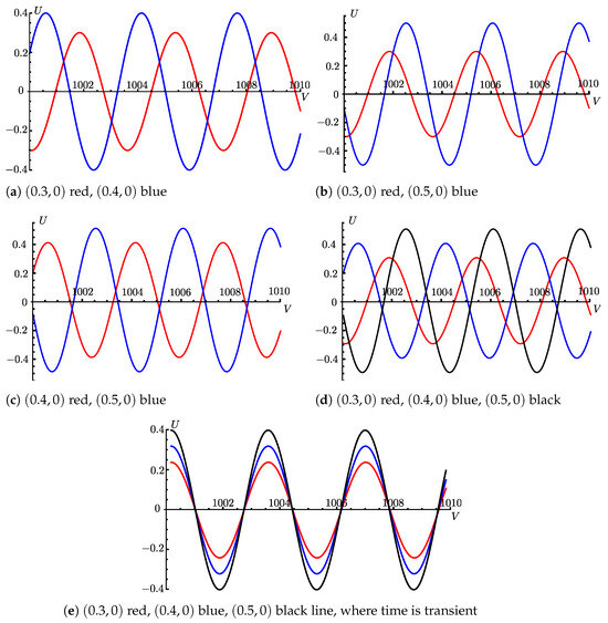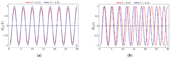 Figure 4a,b illustrate the influence of the parameter on the dynamical response of at a specific time and position . In Figure 4a, it is evident that when time is held constant, the parameter affects the amplitude of the wave without inducing any phase difference. Conversely, in Figure 4b, the parameter does not impact the amplitude but causes a slight forward shift in the wave, resulting in a phase difference.