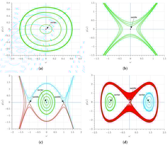 They act as saddle points when , as centers when , and as cuspidal points when . To illustrate the phase portrait analysis of System (19), we explored various combinations of the parameters. The phase portraits illustrating the dynamical behavior of the system in Figure 6 depend on the following configurations of parameters: