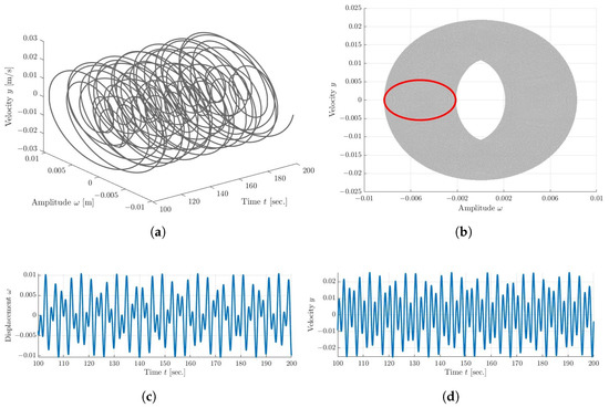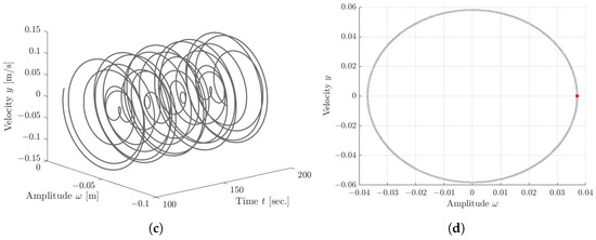 In Figure 2 and Figure 3e,f, the distribution of amplitude over time and space is illustrated. The values of the function are depicted using shades, revealing how the amplitude changes along the beam and over time as well. In Figure 3, we observe blurred and less distinct cyclically appearing regions compared to Figure 2. Additionally, under certain assumed boundary conditions and vibration frequencies, density diagrams revealed standing and traveling wave phenomena, where the deflection exhibits a characteristic pattern resembling a standing wave. Contour plots depict the dominant modes of vibration in the beam, with different contours corresponding to different vibration modes. As a result of this modal analysis, Figure 3 indicates a greater unevenness in the distribution of modes for the solution .