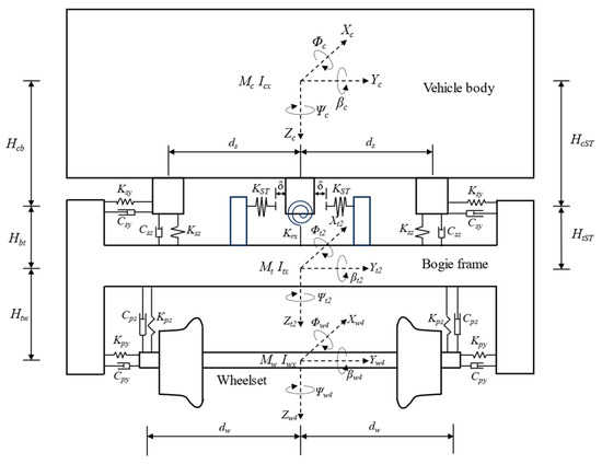 A vehicle model is composed of the following seven components: one vehicle body, two bogie frames, and four wheelsets, and all are represented as rigid bodies. In addition, two sets of suspension systems are also established using springs and dampers to buffer relative motion between adjacent components and mitigate dynamic responses. In this study, anti-roll springs, lateral stop devices, and traction rods are considered thoroughly, which are frequently overlooked in previous research. Nevertheless, the influences of them on the high-speed trains’ dynamic responses under extreme operating conditions cannot be disregarded.