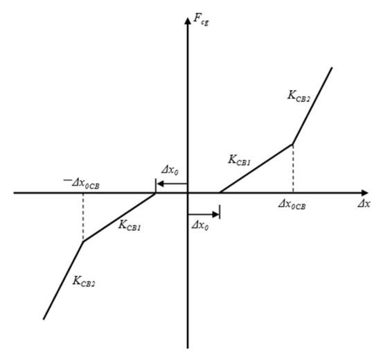 In this study, the coupler draft gear is conceptualized as a spatial two-force member, only capable of axial elongation and compression, and hinged at the centers of the bases of adjacent vehicle body ends. For simplification, the mass is neglected. The coupler draft gear’s nonlinear stiffness characteristics, including the gap, are simulated using a bilinear model, as shown in Figure 4. The force generated by coupler draft gear can be represented by Equation (1).