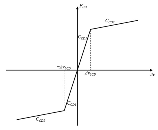 This paper simplifies the longitudinal vibration absorption device as a damper hinged to the edges of the bases at the ends of adjacent vehicle bodies. Similar to coupler draft gear, it is only capable of axial elongation and compression, and the damping force is generated through differential axial velocities at its ends. Additionally, the nonlinear damping characteristics of the device are considered in this study, as depicted in Figure 5. The damping force FCDL(R) can be represented by Equation (3).