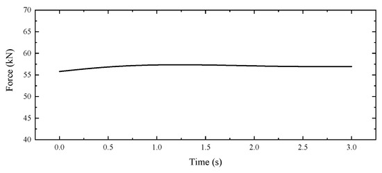 Field testing is restricted to railway departments or institutions authorized by them in China; hence, conducting on-site tests is almost impractical. Additionally, the routine operation of the railway network would be disrupted by these experiments. Furthermore, regarding the data of on-site tests organized by the railway department, we are almost unable to access the mechanical parameters of trains and track structures, which means that the simulation parameters are incomplete and prevent us from using accurate parameters to replicate real circumstances. Thus, in this section, utilizing vehicle and track structure parameters listed in Table A1 and Table A2, the correctness of the established model in this study is verified from a numerical reliability standpoint. Assuming the ideal running conditions without considering track irregularities, the operating speed of the railway vehicle was set to 60 km/h. The time histories of wheel–rail vertical force as well as rail vertical acceleration and displacement are presented in Figure 8 and Figure 9, respectively.