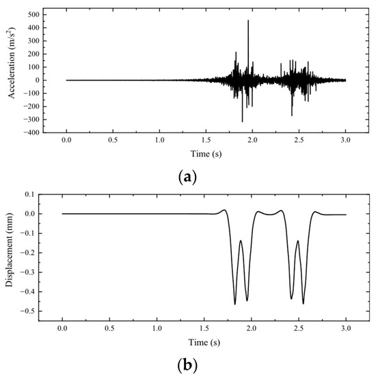 Rail vertical acceleration and displacement time histories: (a) rail vertical acceleration and (b) rail vertical displacement.