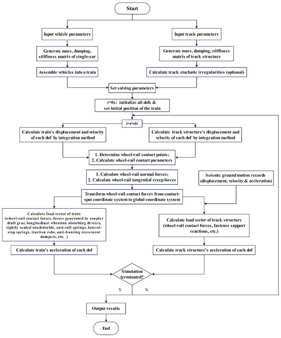 where subscripts “g” and “t” represent support nodes and non-support nodes. is the force vector applied on the track subsystem due to seismic excitations. The meaning of other physical quantities can be referenced in Equation (14). By expanding Equations (18) and (19) can be obtained.