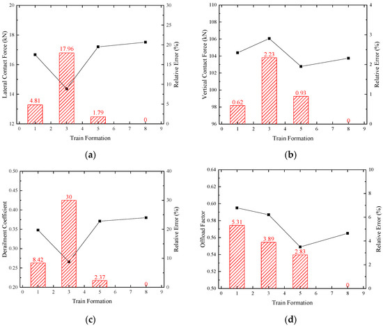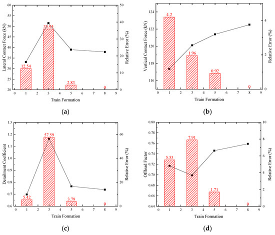 Variation trend of wheel–rail interaction indices’ peak values and relative errors versus train formations (PGA = 400 gal): (a) wheel–rail lateral force; (b) wheel–rail vertical force; (c) derailment coefficient; and (d) offload factor.