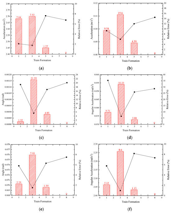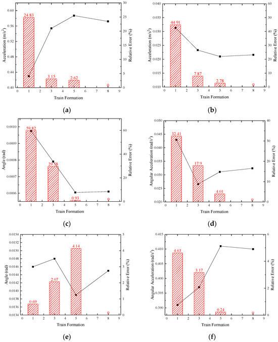 This subsection primarily investigates the influences of train formation on the dynamic responses and operational safety of trains under non-uniform seismic excitation from the perspective of vehicle kinematic indices. In accordance with current railway standards, the vehicle body’s dynamic response is a pivotal criterion for assessing the operational safety. Table 5 and Table 6 present the peak values and relative errors of lateral and vertical accelerations of vehicle bodies for various train–track coupled dynamic models with different kinds of train formations under two levels of input seismic acceleration, along with several other degrees of freedom of the vehicle bodies for supplementary evaluation. Additionally, to visually demonstrate the variation trends of displacement or acceleration for each degree of freedom, Figure 14 and Figure 15 depict the peak value trends of each index under two levels of seismic intensity, with the absolute values of relative errors presented in bar chart form.