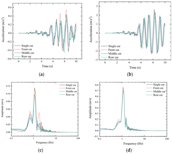 The results also indicate that although the wheel–rail interaction indices for the single-car model exhibit larger errors compared to those of the 5-car formation, they are substantially lower than those obtained in the 3-car formation model. Consequently, the single-car model can still meet accuracy needs for rough qualitative analysis and offers advantages in computational speed compared to the 5-car model, facilitating rapid and preliminary assessments of train operational safety and wheel–rail interactions prior to more detailed quantitative analysis. Additionally, it should be noted that relative to the 8-car standard formation, the wheel–rail interaction indices for the single-car model are comparatively smaller. This may be due to the interactions between adjacent vehicles, which tends to amplify wheel–rail interactions. Furthermore, the train with multi-car formation allows the track subsystem to receive more energy through wheel–rail contact interfaces simultaneously, leading to more pronounced dynamic responses in the track structure. This effect is compounded by dynamic feedback and coupling mechanisms between the train and track, intensifying the train’s dynamic responses and, consequently, the severity of wheel–rail interactions. Specifically, for seismic inputs with a peak acceleration of 100 gal, where the seismic intensity is lower, the interaction indices of the single-car model are slightly greater than those of the 8-car formation model. However, with inputs at a peak acceleration of 400 gal, the wheel–rail lateral force, wheel–rail vertical force, derailment coefficient, and offload factor are all lower than those of the 8-car formation model, with relative errors of −12.54%, −4.20%, −5.42%, and −5.53%, respectively.
