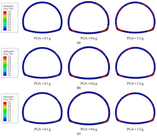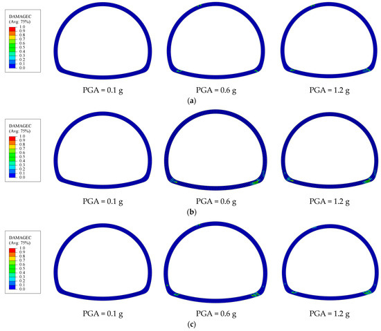 - The 2D soil–tunnel numerical models are used to conduct IDA by adjusting PGA, and the evolution of damage with IM is obtained.