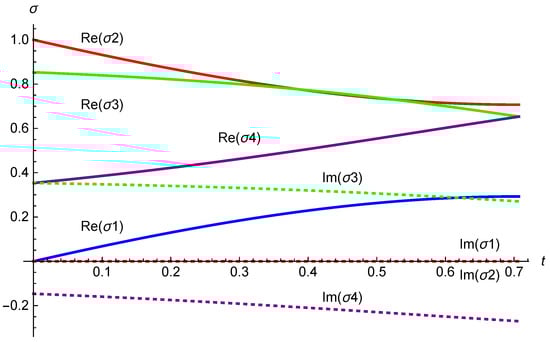 Numerical evaluation of the integral curve for the supertranslation vector field (52). The initial conditions (72) are taken to be . In this particular case, the real parts meet at a single point.