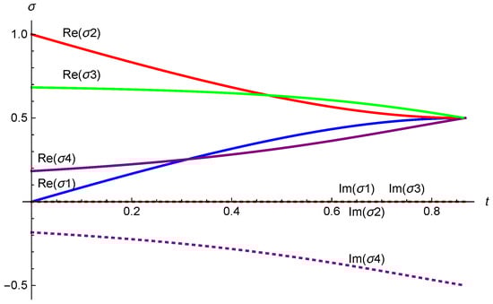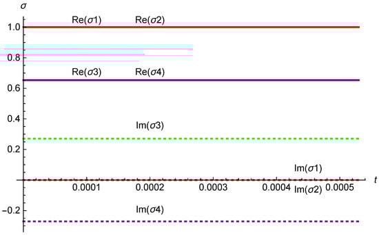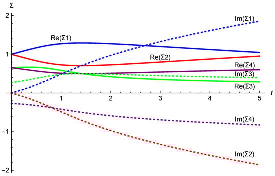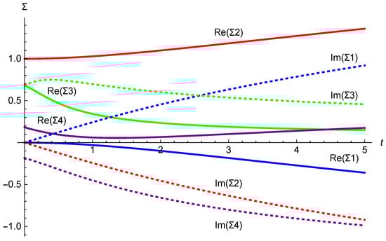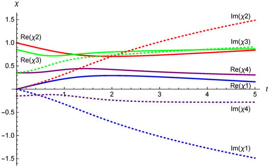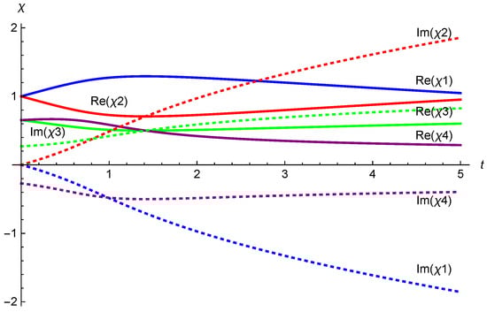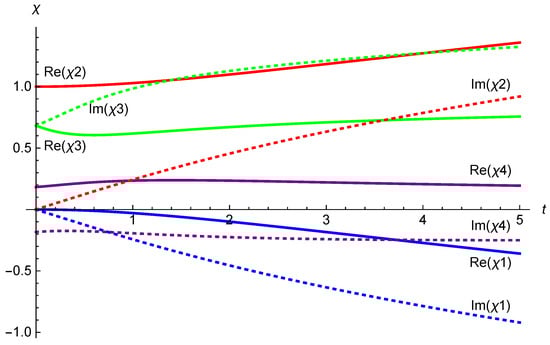 The resulting equations can only be solved numerically to the best of our knowledge, and such solutions are displayed in Figure 1, Figure 2, Figure 3, Figure 4, Figure 5, Figure 6, Figure 7, Figure 8 and Figure 9. Since the desired solutions are complex-valued, we display both real and imaginary parts, with three choices of initial conditions.