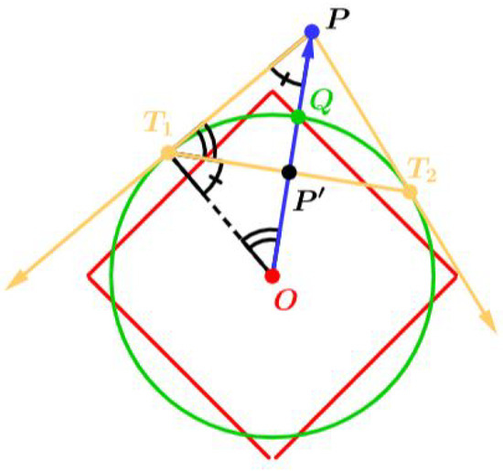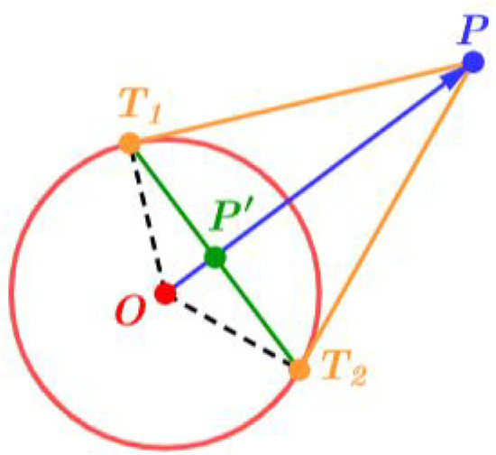 If P is an exterior point to , then the point Q, which is the intersection of the circle by the ray is determined. Afterward, an Euclidean circle C is constructed with the radius and centered at the point O. Let the points where the tangent lines drawn from the point P to the Euclidean circle touch the Euclidean circle be labeled and . Thus, the point where the line segment intersects the ray is the inverse of the desired point (see Figure 5).