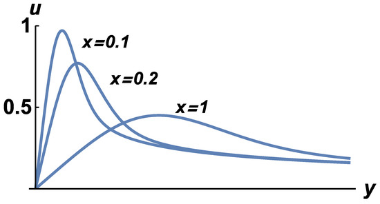 The remarkably simple solution (58) can be interpreted as a two-dimensional jet impinging on the leading edge of the rigid impermeable surface of a body, such that the surface is along the x-axis being infinitely long downstream and the leading edge is at , while the body extends in the negative y-direction. The slit, from which the jet emerges at , is assumed to be infinitely small so that, in order to have a finite rate of the flow volume discharged per unit height of the slit, and a finite flux of momentum, a fluid velocity in the slit should be infinite (as it is in Equation (59)). The jet spreads outwards in the downstream direction, whereas the velocity of the jet decreases in the same direction due to the influence of (internal) friction. Profiles of the u-velocity at different x are shown in Figure 1.