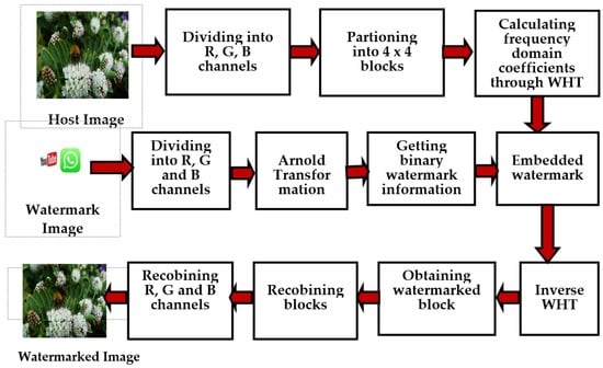 The proposed watermarking technique belongs to the double-color image watermarking technique, which is designed for applications like copyright security due to its big-data capacity. Additionally, this watermarking method is blind. Being blind, it does not require the original image for extraction, ensuring the watermark’s information remains protected. The subsequent sections of this manuscript are arranged in the following manner. Section 2, Preliminaries, presents the rudimentary principles and pertinent knowledge employed in the proposed watermarking technique, encompassing the Arnold transform and WHT. Section 3 expounds on the watermark insertion and retrieval procedure suggested in this manuscript. Section 4 examines and assesses the efficacy of our approach utilizing extensive empirical data. Finally, some relevant conclusions are offered in Section 5.