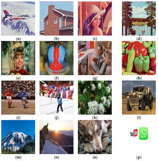 The color host images and a color watermark image used for the experiments. (a–o) The host images with dimensions of ((a)–(l)—512 × 512 pixels, (m)–(o) 2048 × 2048 pixels), and 24-bit color depth, and (p) a color watermark image.