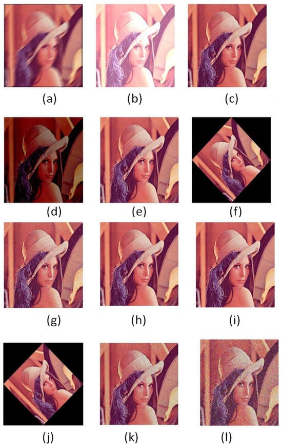 To evaluate the algorithm’s robustness, at first, a color watermark picture in Figure 4p was embedded into color cover images in Figure 4 before subjecting them to 12 different attacks. As an example, the resulting watermarked images and their extracted watermark images for host image Figure 4 care shown in Figure 6 and Figure 7, respectively. These figures provide compelling evidence of the algorithm’s remarkable ability to withstand common attacks, except for cases involving geometric distortions such as scaling plus rotation. Even when subjected to attacks, our method excels at extracting the color watermark image with minimal distortion.