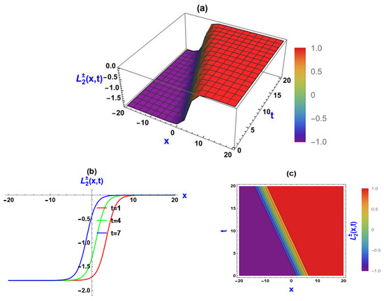Depiction of Equation (69) for : (a) 3D view of the kink solitons, (b) 2D view of the kink solitons, and (c) contour view of the kink solitons.