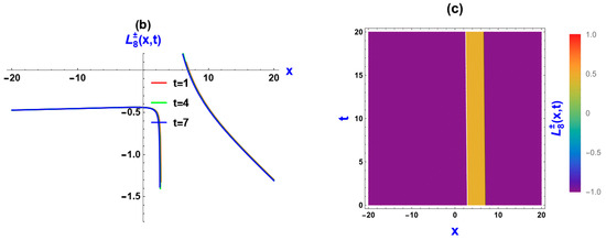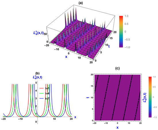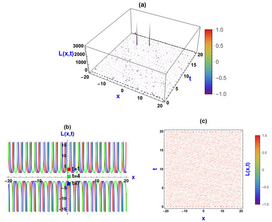 Depiction of Equation (68) for , and : (a) 3D view of the multi-singular solitons, (b) 2D view of the multi-singular solitons, and (c) contour view of the multi-singular solitons.