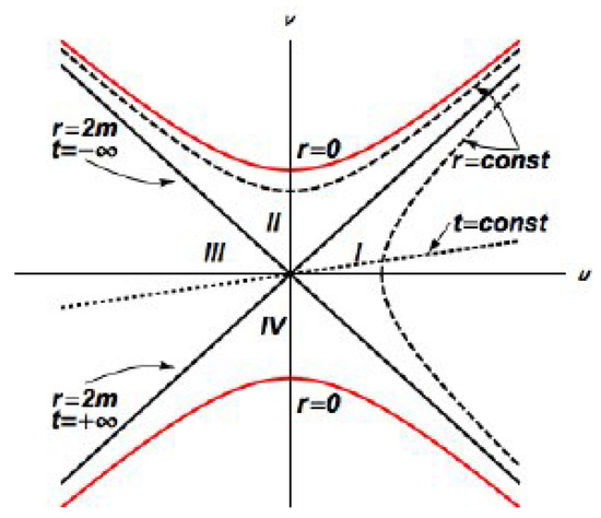 Regions of spacetime associated with the Schwarzschild geometry using the Kruskal coordinates . The angular coordinates have been suppressed. The dotted lines shown in regions I and II are typical curves of constant r. Trajectories of constant t are straight lines through the origin. The solid black lines are the event horizon r = 2 m. The red hyperbola in regions II and IV is the singularity at . The 2D spacetime discussed in Section 5 maps exactly onto this picture, although, in the Schwarzschild case, the geodesics are not straight lines.