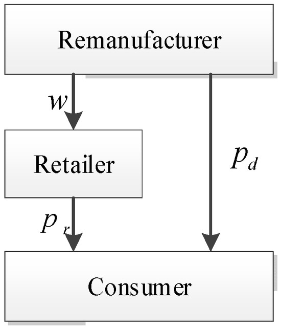 We consider a two-stage supply chain system involving a remanufacturer (denoted as ) and a retailer (denoted as ). In the production and sale of remanufactured products, remanufacturers serve as the pivotal enterprises in the remanufacturing production line. Consequently, we assume that the remanufacturer is the dominant player in the Stackelberg game and sells products through offline direct channels at a price denoted as . Simultaneously, the remanufacturer wholesales the products to the retailer at a price denoted as . Subsequently, the retailer resells the wholesale products through an online channel at a price denoted as . This supply chain model is quite common in the production and sale of remanufactured products. For example, Greencitizen is a company dedicated to remanufacturing and recycling electronic products. They offer remanufactured electronic products, such as computers, photography equipment, and other electronic devices, in their offline channel. Additionally, they also collaborate with online retailers such as Newegg to distribute their products. This system is illustrated in Figure 1.