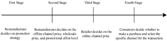 This study constructs a dynamic game model under demand uncertainty. The sequential stages of the game are as follows: (1) The remanufacturer, who is the dominant player, decides on the promotion strategy. (2) The remanufacturer decides the offline channel product price, wholesale price, and the level of promotion effort. (3) After observing the remanufacturer’s pricing decision, the retailer decides the online channel product price. (4) The consumers decide whether to make a purchase and specific channel for the transaction. This decision sequence is shown in Figure 2.