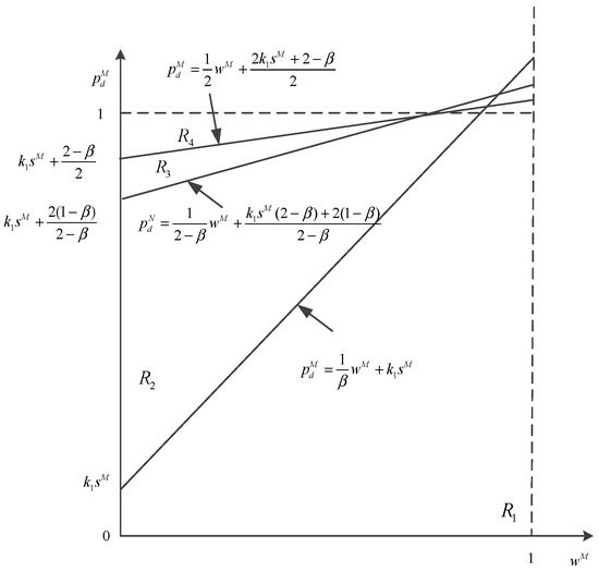 In Region IV, when , the demand for the offline channel is 0. In accordance with the assumption of incentive compatibility, the remanufacturer lacks the incentive to carry out promotion strategies. In Region III, when , the retailer’s optimal price is attained at the boundary. Comparative analysis of profit values in the two boundary regions indicates higher profits when . As a result, the remanufacturer continues to lack the incentive to implement promotions in this region. Consequently, the subsequent analysis exclusively concentrates on the decision-making processes in Regions II and I. In addition, since all data in this paper have been normalized, the dashed lines represent the maximum range of and .
