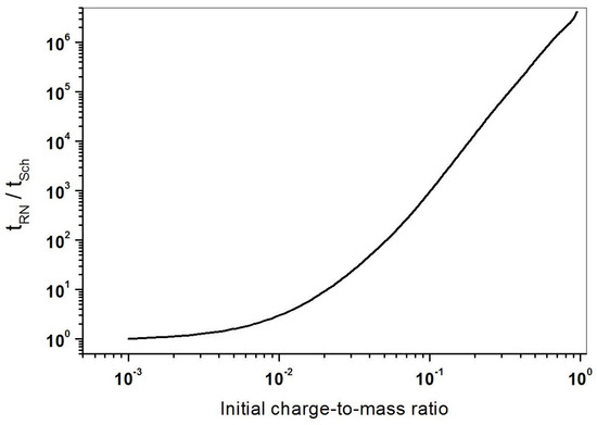 Numerical solutions of Equation (13) for different values of the initial charge-to-mass ratio permit for obtaining how the Hawking evaporation lifetime is affected by the presence of a charge. Numerically, we have assumed that extremality is attained when the condition is satisfied. However, for values of , the latter condition is approached very slowly and another time variable x was introduced in Equation (13) by defining . With this definition, the initial condition is not modified since implies also that and Equation (13) becomes