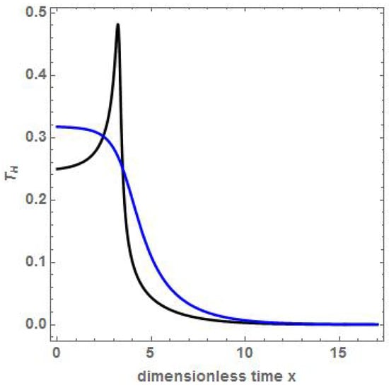 Figure 4 illustrates this behavior, showing the horizon temperature evolution for two initial values of the charge-to-mass ratio . The black curve corresponds to , a value smaller where the critical value ; the temperature grows initially, passes by a maximum corresponding to the discontinuity point, and then decreases to zero, when the extremality is attained. The blue curve corresponds to , an initial charge-to-mass ratio higher than the critical value. As expected, the horizon temperature is always decreasing since the heat capacity is positive in this charge-to-mass range.