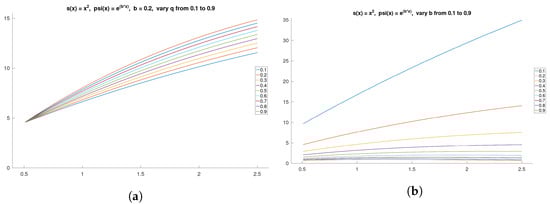 We investigate the impact of the quantum number q and parameter b on the definite quantum integral by varying these parameters. In Figure 2a, parameter b is set to while the quantum number q is adjusted from to . Conversely, in Figure 2b, the quantum number q is fixed at , and parameter b is varied from to . The selected domain remains . To visualize the result, we approximate the definite integral, which is expressed as an infinite sum, by setting . The results indicate that increasing parameter b significantly sharpens the curve, whereas increasing the quantum number q slightly reduces its steepness. The observed pattern exhibits an opposite trend compared to the quantum derivative example.