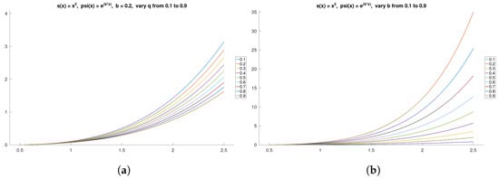 By varying the parameters q and b, we illustrate their influence on the quantum derivative to a given function . Figure 1a shows the impact of the quantum parameter q, varied from to , while we fixed parameter b to . Then, we fix the quantum number to and vary parameter b from to , with the results displayed in Figure 1b. And the considered domain of this example is chosen to be The graphs demonstrate that increasing the quantum number q makes the curve slightly steeper, whereas increasing the parameter b results in more significant changes to the graph, but in an opposite manner.