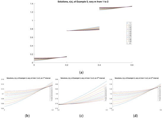 We visualize the numerical example by plotting the solutions of Example 5 to provide the reader with a clearer understanding of this work. Figure 3 and Figure 4 depict the solution functions, s and r, respectively, of this example by varying parameter m from 1 to 2. The figures evidently demonstrate that functions s and r exhibit jump discontinuities as anticipated. Figure 3a and Figure 4a provide overviews of functions s and r across the entire considered domain, while Figure 3b–d and Figure 4b–d illustrate the values of functions s and r within each interval.