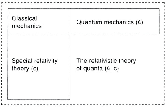 Those ideas may have found no practical use or meaning and attracted little attention at the time, but were shared by M. Bronstein, a well respected mate of the Jazz Band (Landau, Ivanenko and Gamow), who had talked about the limits of theories and was deeply concerned by the general physical picture of the world as a whole. He was one of the few that continued research on gravitation during the 1930s, talking about a unified theory that would marry the field theory of quanta, the electromagnetic field and gravitation. This unified theory would be a cosmological theory. Einstein too was looking for a unified theory, but by trying to deduce quanta from his generalized theory of relativity, while Bronstein recognized both theories as equally fundamental that needed some kind of synthesis [2]. In [5], he published two diagrams, reproduced in Figure 1 and Figure 2, where he maps the world of physics. In Figure 1, the areas of applicability of classical mechanics, quantum mechanics and special relativity are delimited by intersecting rectangles. The dotted lines correspond to a broader area for the not yet well-defined quantum relativistic theory that would contain the other three areas. Such theories are characterized by the presence of the two fundamental constants c and ℏ. Figure 2 is not about areas of applicability but relations between the theories themselves, including general relativity theory and the theory of quanta-electromagnetic field-gravitation, which would in turn be the “cosmological theory”. The dotted lines correspond to unsolved problems. Notice that this representation does not include Newton’s gravitation, nor a path from G-theory to -theory.