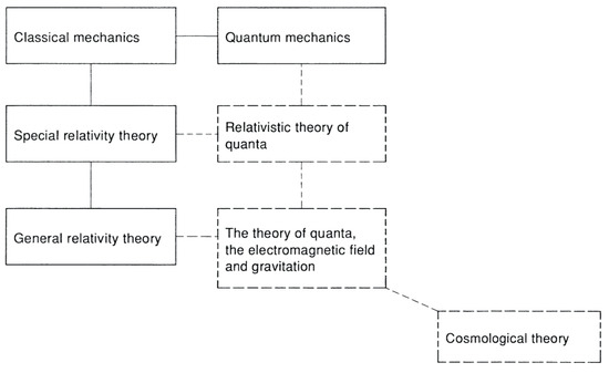 Bronstein’s space of physical theories and their correlation to cosmology. “Continues lines correspond to already existing theories. Dotted lines correspond to still unresolved problems” (Image taken from [2] under a Creative Commons Copyright License).