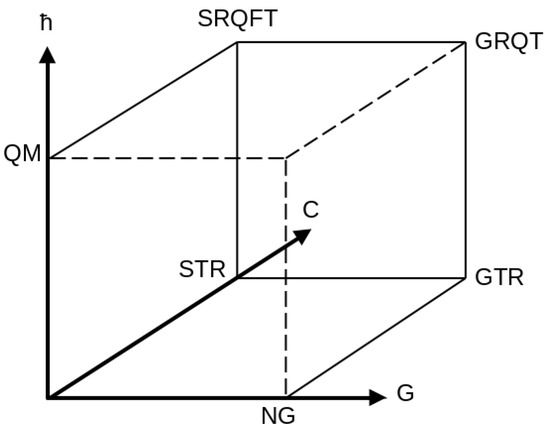 Redrawing of Zel’manov’s cube of physical theories in the cGℏ coordinate system, as described by Gorelik and Frenkel [8]. Acronyms are as follows: NG: Newton’s theory of gravity; STR: Special theory of relativity; QM: Quantum mechanics; GTR: General theory of relativity; SRQFT: Specially relativistic quantum field theory, GRQT: General relativistic quantum theory. Notice there are two corners without a label.