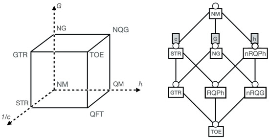 On the left: the cube of physical theories by Okun [7], where TOE, NM and QFT appear, and the c axis is now the 1/c axis. The abbreviations in the diagram stand for NM—Newtonian Mechanics; NG—Newtonian Gravity; STR—Special Theory of Relativity; QM—Quantum Mechanics; GTR—General Theory of Relativity; NQG—Non-relativistic Quantum Gravity; QFT—Quantum Field Theory; TOE—Theory of Everything. The figure on the right corresponds to the lattice of physical theories. Unlike a cube with coordinate axes, where Newtonian Mechanics (NM) lies at «the origin» (0,0,0), here it lies in the supreme node while the Theory of Everything (TOE) is at the bottom node. We have generalized even more the names for NQG to non-Relativist Quantum Gravitation (nRQG), QM to non-Relativistic Quantum Physics, and QFT to Relativist Quantum Physics (RQPh) in order to accommodate other models that would describe such regimes.