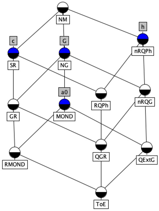Lattice of fundamental constants includes Milgrom’s constant and four new model theories: Extended Gravitation (ExG), Extended Relativistic Gravitation (ExRG) and Extended Quantum Gravitation (ExQG). Relativistic Quantum Gravity (QGR) replaces the original Theory Of Everything (TOE), leaving the new TOE in the lowest node, which does not exist either, but would have to include all fundamental constants—that is, all regimes. Blue half nodes indicate a new attribute; black half nodes indicate a new object.