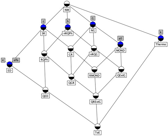 Following the idea that distinguished elements such as fundamental constants may represent classes of potential models of physical theories, and using FCA to classify theories and construct theoretical networks, we proceed to interpret Zel’manov’s cube as a concept lattice (Figure 4). In the right side representation of Figure 4, the positions of the nodes are reflected on the horizontal plane: Newtonian Mechanics (NM) is no longer at the origin but at the top node, while the Theory Of Everything (TOE) has moved to the bottom node. We have called “non-Relativistic Quantum Physics” (nRQPh) and “Relativistic Quantum Physics” (RQPh) to all classes of physical theories that require ℏ and c in their mathematical description. As such, QM and non-relativistic QFT enter a general classification scheme called nrQPh and QFT enters RQPh. This allows the inclusion of other possible theories that are not QM or QFT into the proper class.