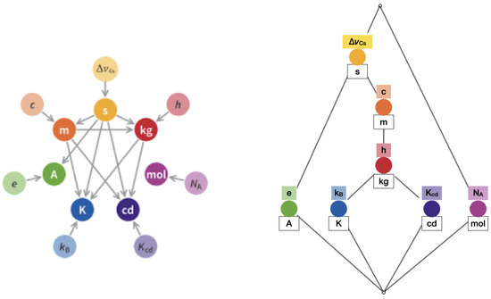 The SI went through a revision during the second decade of the 21st century by the International Committee for Weights and Measures, achieving that all units, including the kilogram, will be defined from fundamental constants that can be obtained by experiment and not from exemplary physical objects. In Figure 7, two representations of the relationships between the units are shown for the SI. The figure on the left side, by Pisanty [49], and published by Lockwood and Rowell [50], presents a circular or heptagon configuration with some disconnected nodes. The figure on the right side is an alternative representation obtained with FCA, which emphasizes the hierarchical level of the constants as attributes and units as objects. The lattice was constructed using the same relations indicated in Pisanty’s diagram and simply adding a top and bottom nodes. It is presented with the same colors for easy comparison. In the lattice, the attributes are the fundamental constants and the basic units are objects. The resulting concepts are as follows: Time, Space, Mass, Temperature, Electric Intensity, Amount of substance and Luminous Intensity. At this point, we draw our attention to the absence of G in the definition of the basic units.