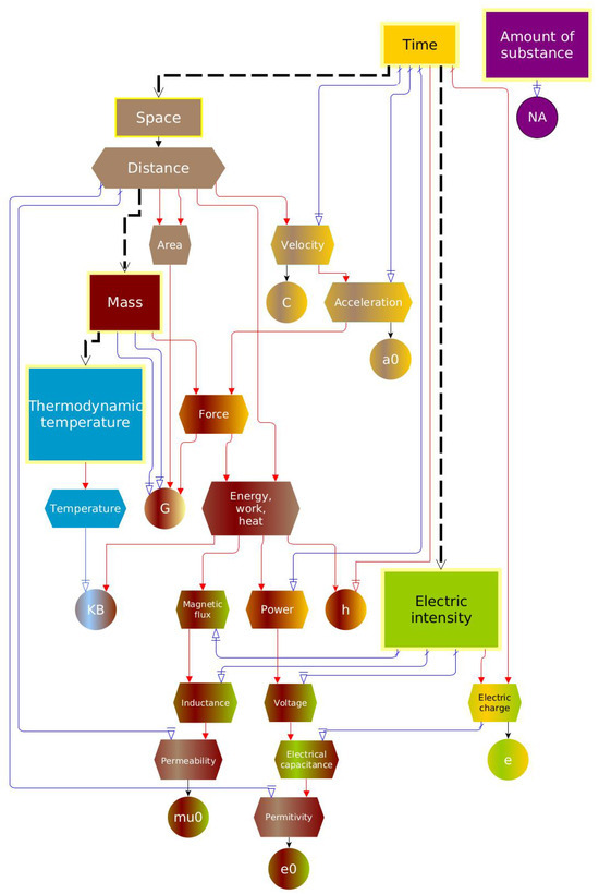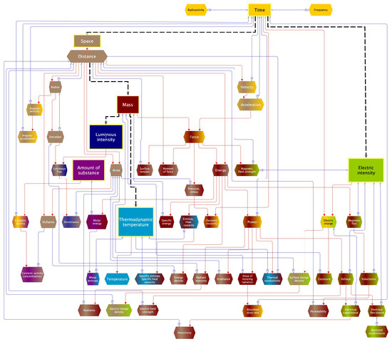 In this diagram, our ontology is based on phenomenology. Our units are artificial objects that we create from the constancy of our observations. We can now build our world based on those objects. In Figure 8, we built a network taking basic units as attributes and magnitudes as objects—relating derived magnitudes such as force, energy, power—and represent their hierarchical placement using two different kinds of relation: multiplication (red arrows) and division (blue arrows). Figure 8 also gives nodes a combination of colors according to their parents’ color. There is still a hierarchy and top-down directionality, but different arrows represent different relations between units. We can find out the basic units of any magnitude just by following the arrows backwards, adding the red ones and subtracting the blue ones.