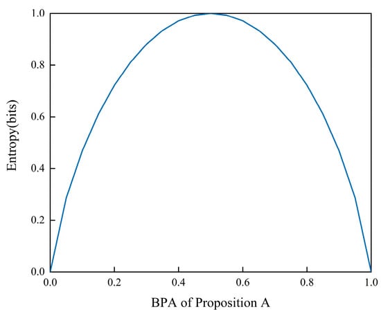 This study attempts to assign weights to evidence sources based on the value of entropy. In the context of binary categorization, it has been observed that as the probability of belonging to one category approaches 0.5, the uncertainty increases, reflecting a state of randomness [43]. Conversely, as this probability deviates further from 0.5 to either extreme (0 or 1), the uncertainty decreases. This observation is consistent with the principle of entropy.