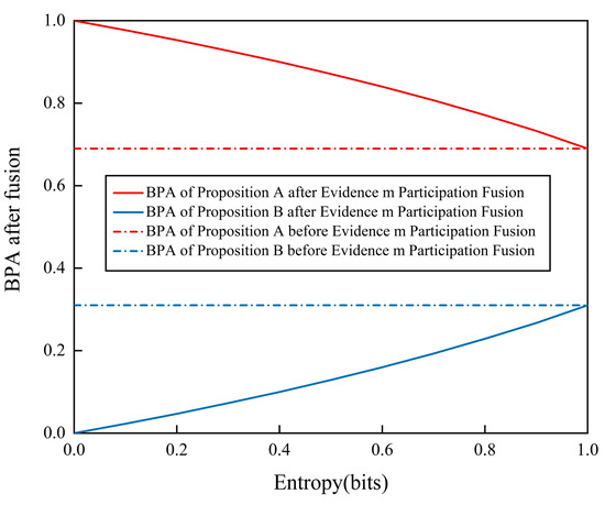 Figure 2 illustrates the correlation between the entropy size of the evidence source and its impact on the data-fusion outcomes. As depicted in the figure, an increase in the entropy of the evidence source m diminishes the effectiveness of data fusion. When entropy reaches its maximum, the third evidence source does not contribute effectively to the data-fusion process. Therefore, the entropy of a source of evidence increases as it approaches invalidity in DS evidence theory.