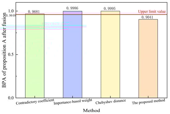 This study examined the relationship between the credibility of the evidence source and the reliability of the subsystem. There was no direct correlation between the sources of evidence. Therefore, in line with the concept of calculating system reliability, the similarity weight is utilized as the maximum limit of the BPA based on the outcomes derived from the parallel system. Given the uncertainty associated with each piece of evidence in determining the BPA, it is logical that the fusion result does not surpass this upper limit. Figure 3 shows the BPA of proposition A after fusion for each method and the upper limit value calculated according to Equation (18), which represents the maximum value of the result obtained from data fusion of the evidence source. The data indicate that only the method posited in this study remained within the prescribed upper limit, as opposed to other methodologies that surpassed this threshold owing to the BPA limit of 1. Incorporating similarity weights can facilitate the generation of fusion outcomes that are conducive to informed decision making within an acceptable range. Consequently, employing the approach delineated in this research can assure the precision and dependability of fusion results.