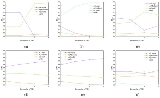 The impact of the number of evidence sources involved in fusion on BPA. (a) DS combination; (b) Yager’s rule; (c) Contradictory coefficient; (d) Importance-based weight; (e) Chebyshev distance; (f) Proposed.