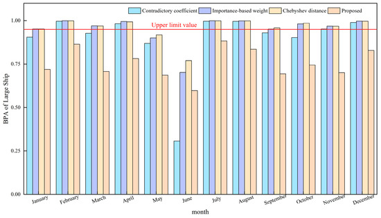 The probability outcomes regarding the presence of large ships, as determined through data fusion employing various enhancement techniques, are shown in Figure 7. Analysis of Figure 7 reveals that the fusion outcomes of the Contradictory coefficient method in June were inaccurate, with other methodologies surpassing the upper threshold to varying extents. Notably, only the fusion outcomes of this particular method were accurate and fell within the acceptable range, which refers to the upper limit value which represents the maximum value of the result obtained from data fusion of the evidence source.